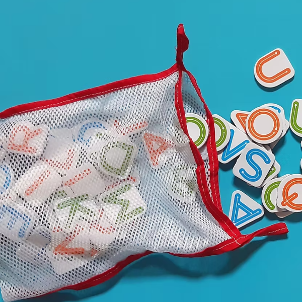 Incluye 72 letras + bolsa de red + guia con flechas para aprender a escribir.